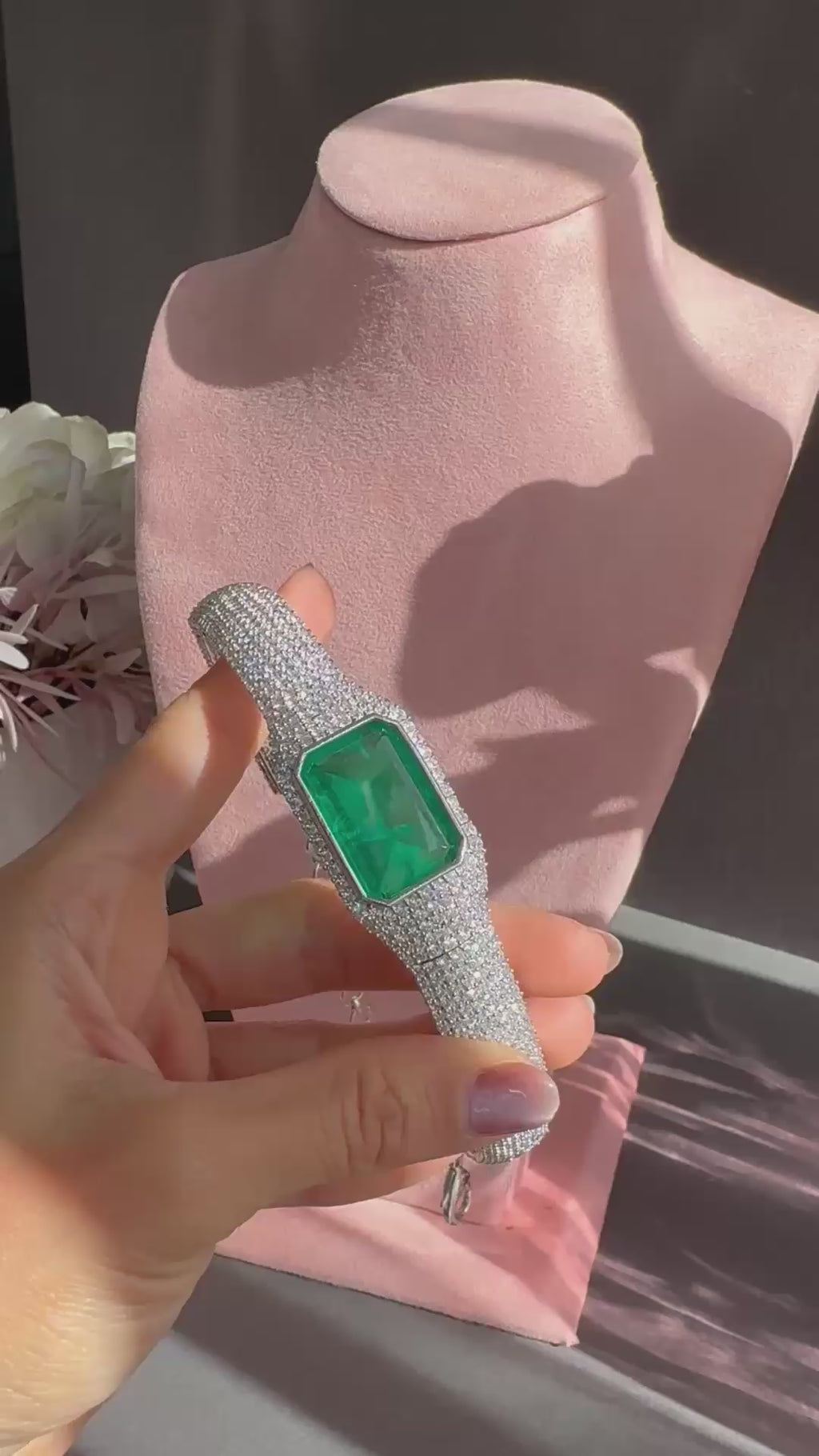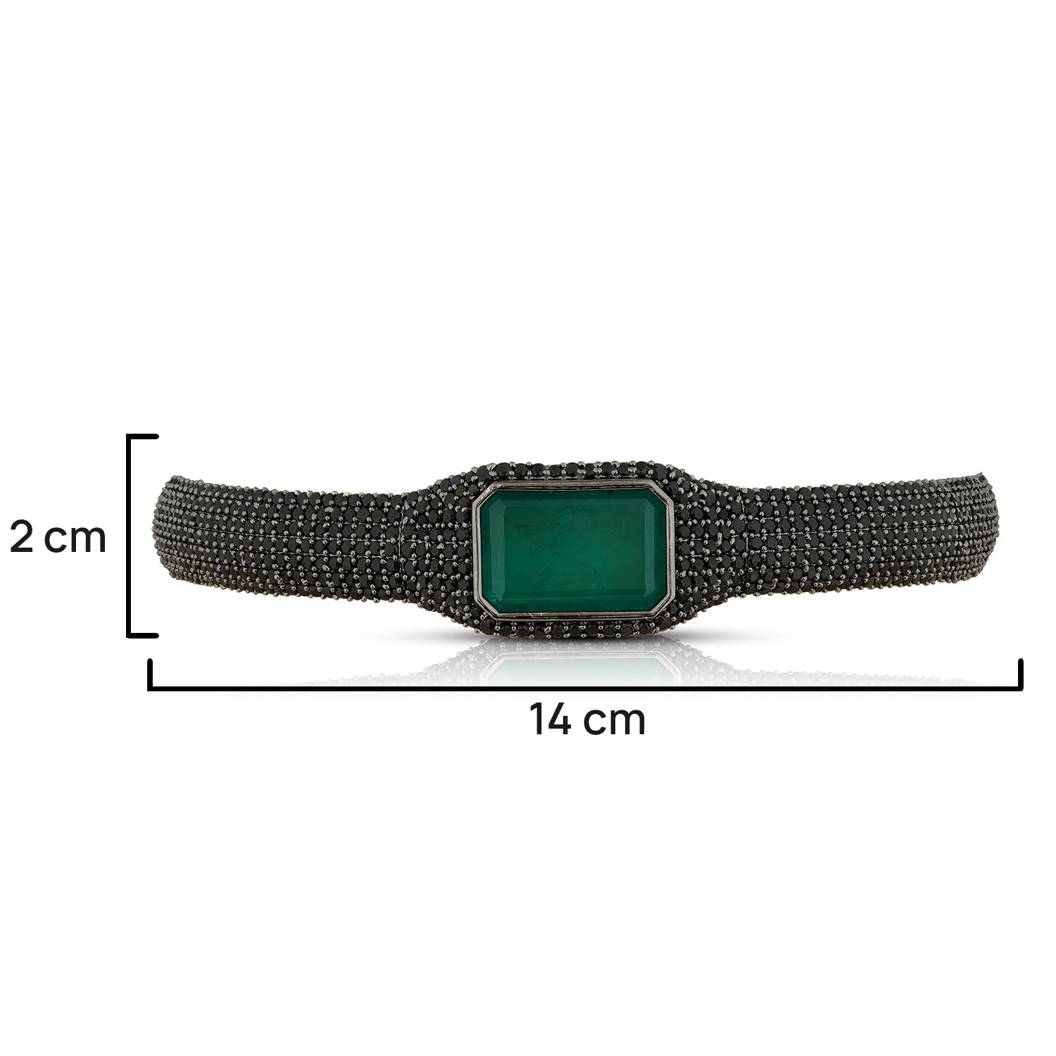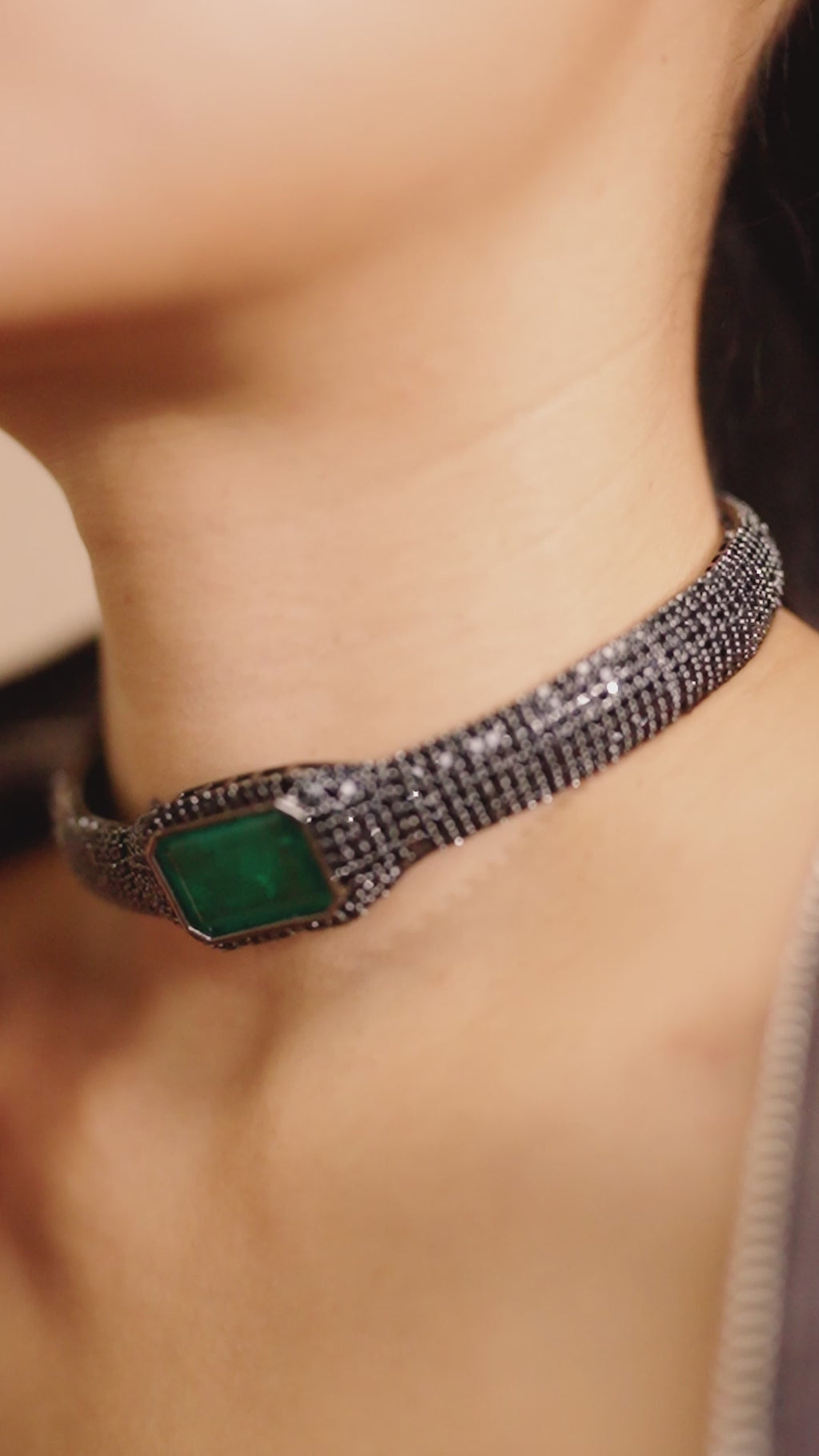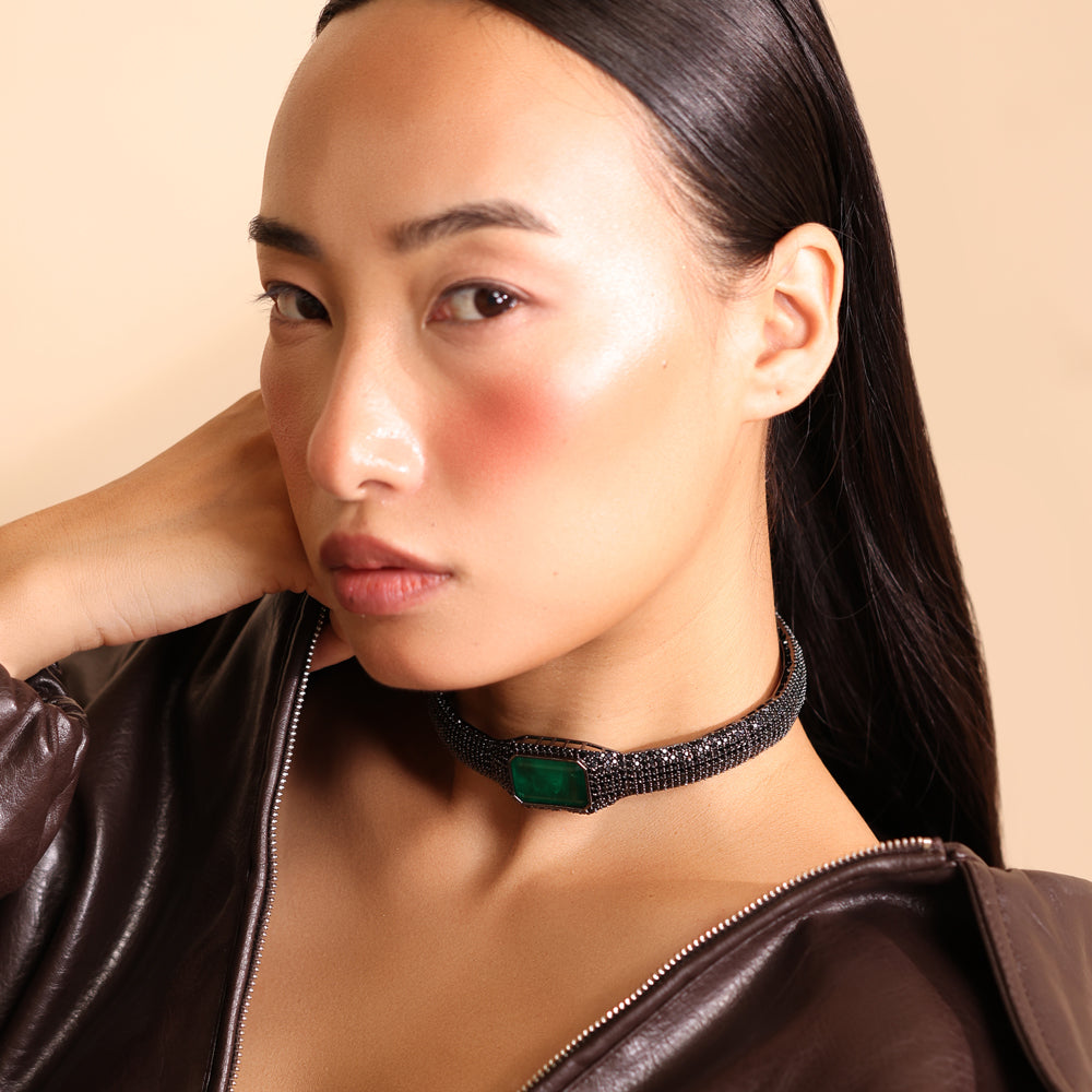 Mystique finds its voice in the Milena Choker — a creation where drama and elegance entwine. A bold emerald-cut green stone rests at its heart, encased within a frame of midnight-black crystals that gleam like constellations in the dark. The choker’s band, a seamless symphony of shimmering black pavé, adds intensity and depth, echoing the allure of nocturnal skies.