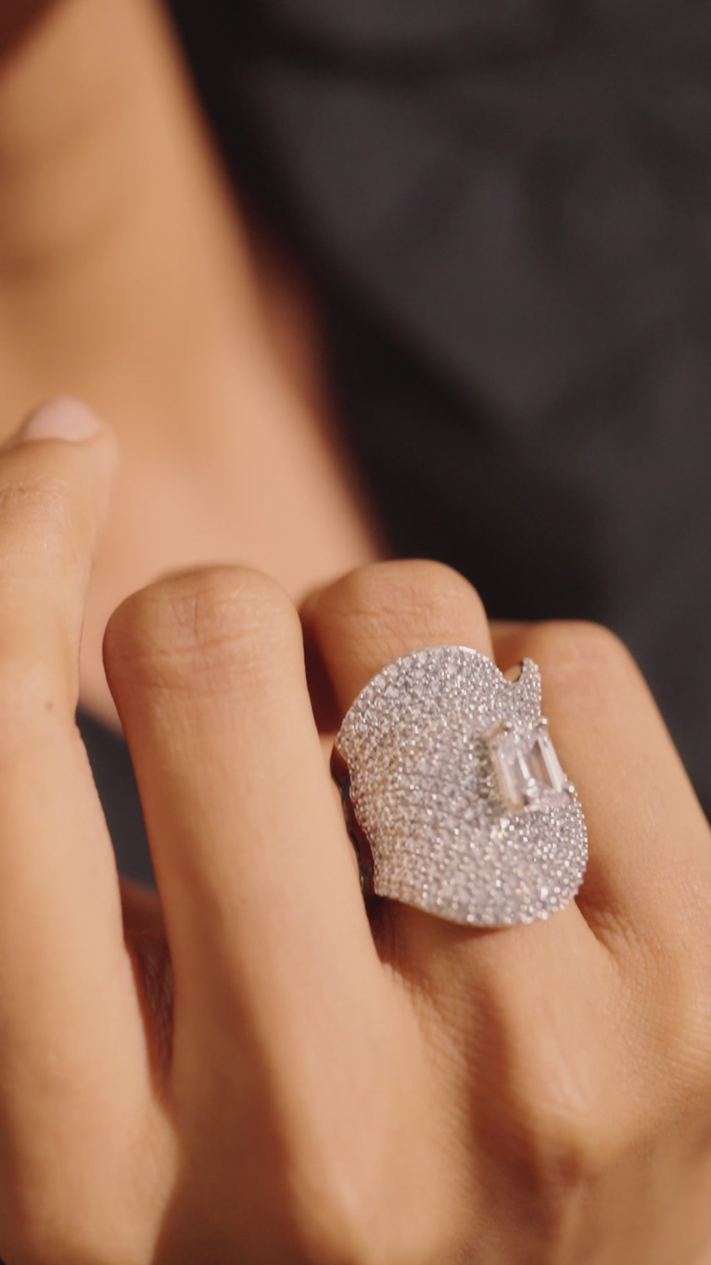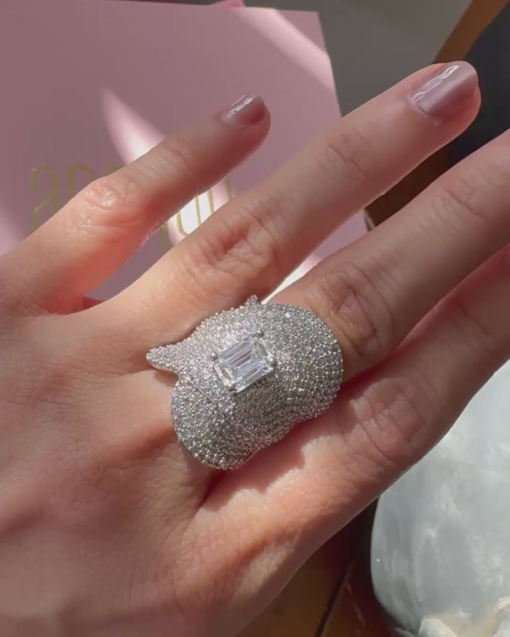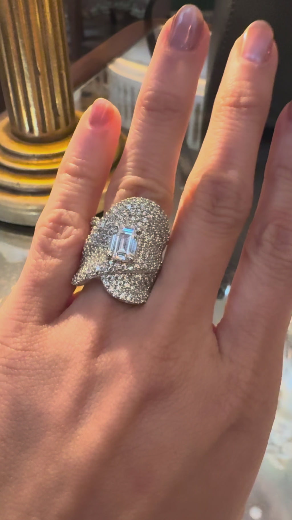 Command attention with this sculptural cubic zirconia dome ring, an artistic marvel of design and craftsmanship. The undulating curves are encrusted with CZ stones, forming a fluid wave-like silhouette. At the center, a prominent emerald-cut cubic zirconia offers a luxurious focal point. This ring is a true couture-inspired piece meant for bold fashion lovers.