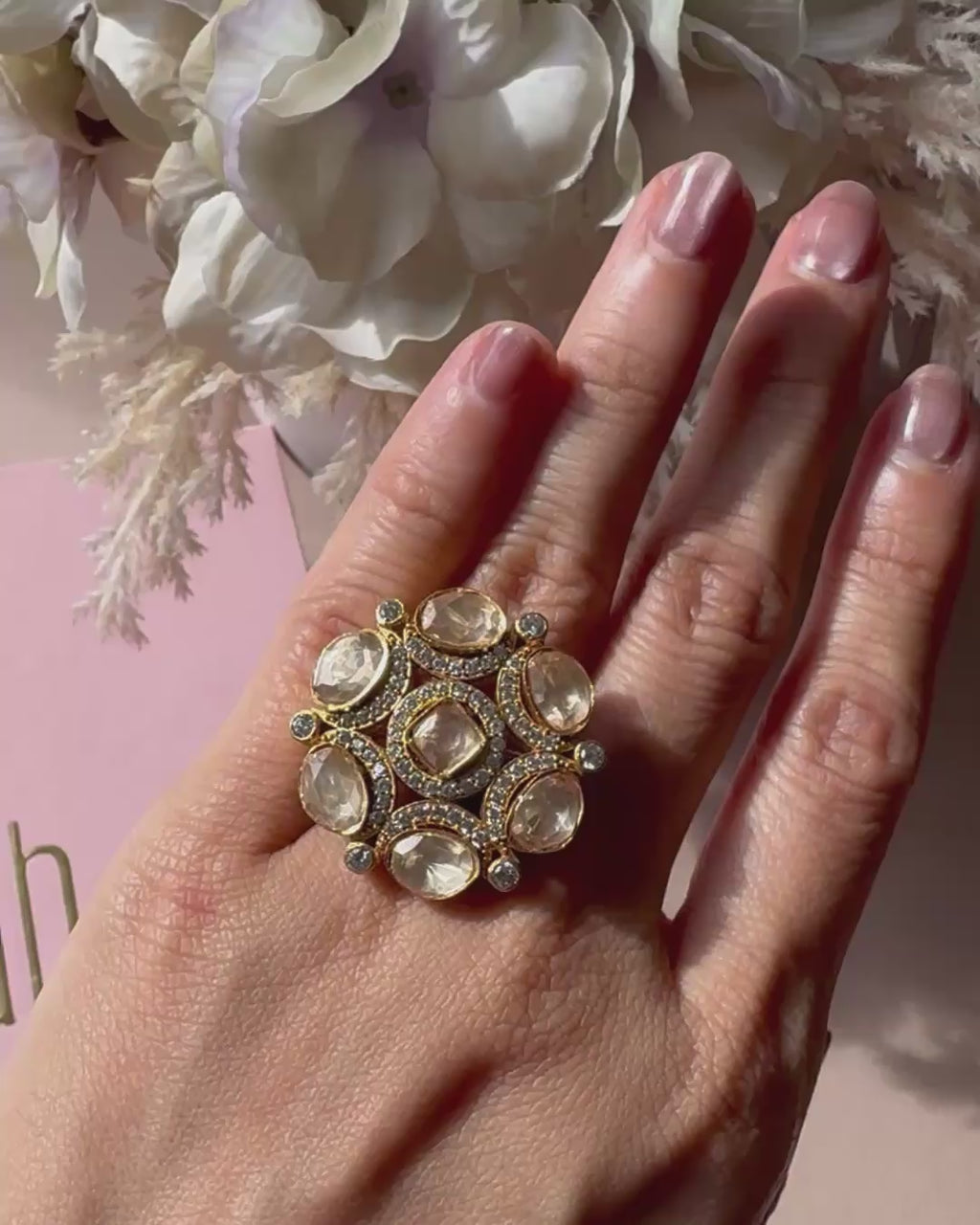 A versatile gold-plated kundan ring with stones.