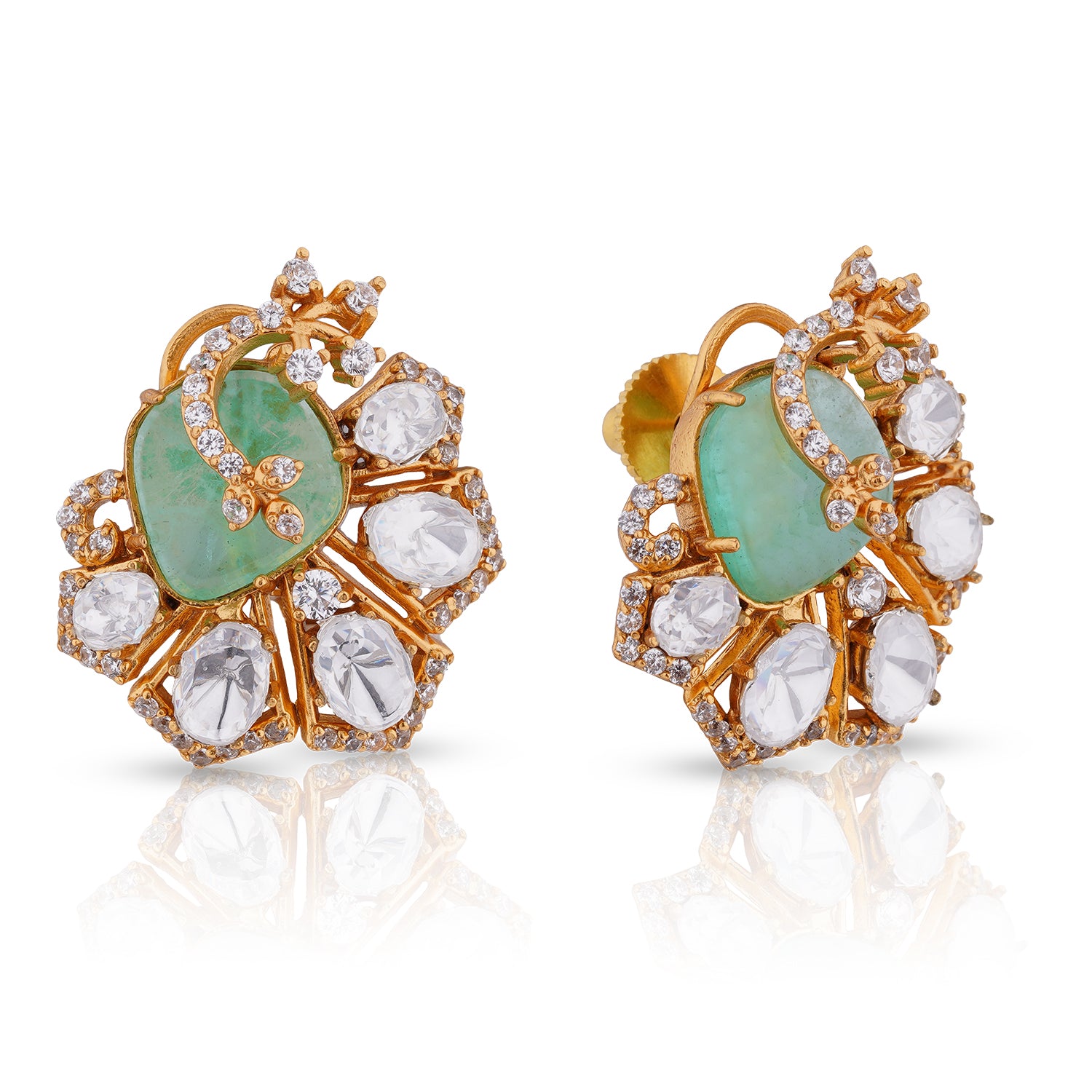 Grace your look with the serene charm of the Akriti - Mint Green Peacock Studs. These earrings feature a soft mint green enamel heart at the center of an exquisitely detailed peacock, accented with kundan-style stones and glimmering cubic zirconia. The antique gold finish adds a traditional richness to their delicate beauty.