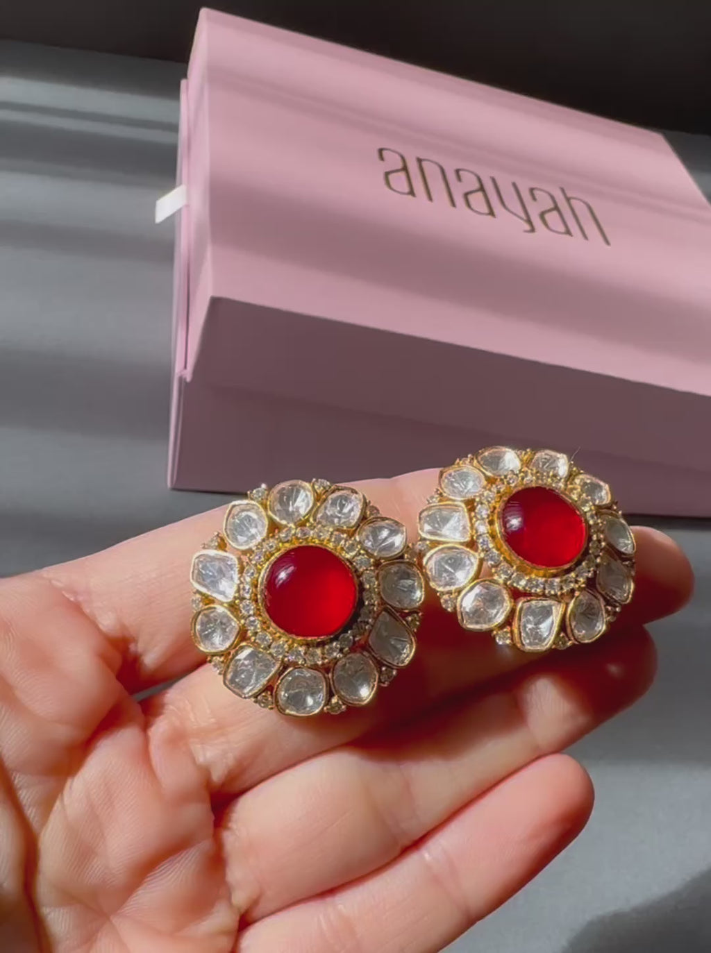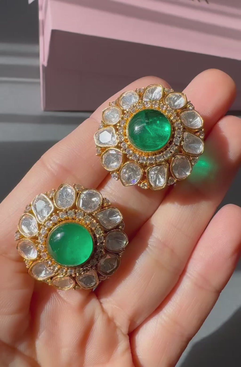 Add a pop of color to your outfit with these stunning green doublet earrings. The vibrant red stone is complemented by sparkling cubic zirconia and polki stones, creating a traditional yet elegant look.