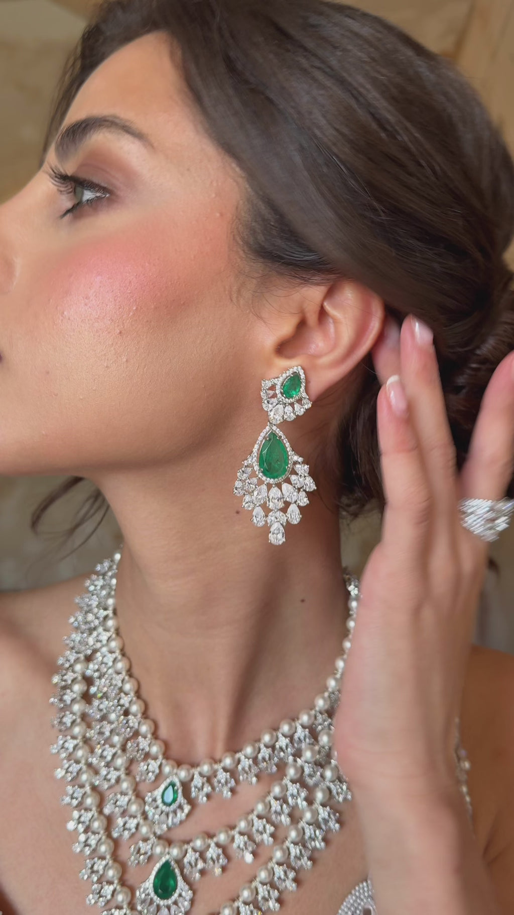 Get ready to turn heads with Amira - the ultimate statement piece! Luxuriate in its stunning 3 layer cubic zirconia and pearl design, complete with a striking emerald green stone pendant. It's the perfect blend of luxury and beauty that will leave your friends green with envy.
