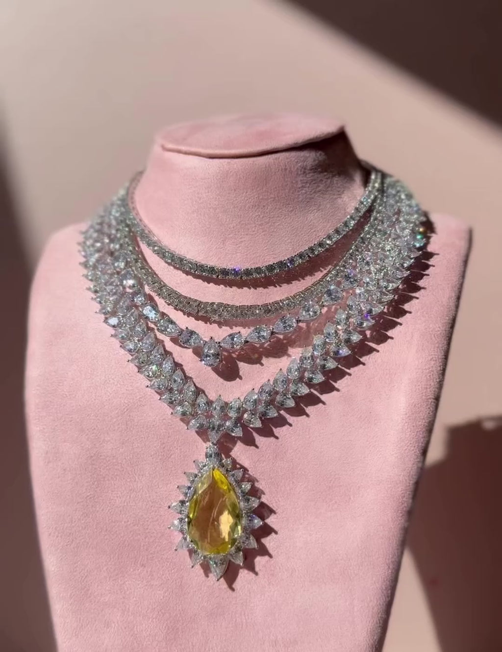 Beautiful multi-layered necklace set adorned with CZ and a yellow centrepiece stone.