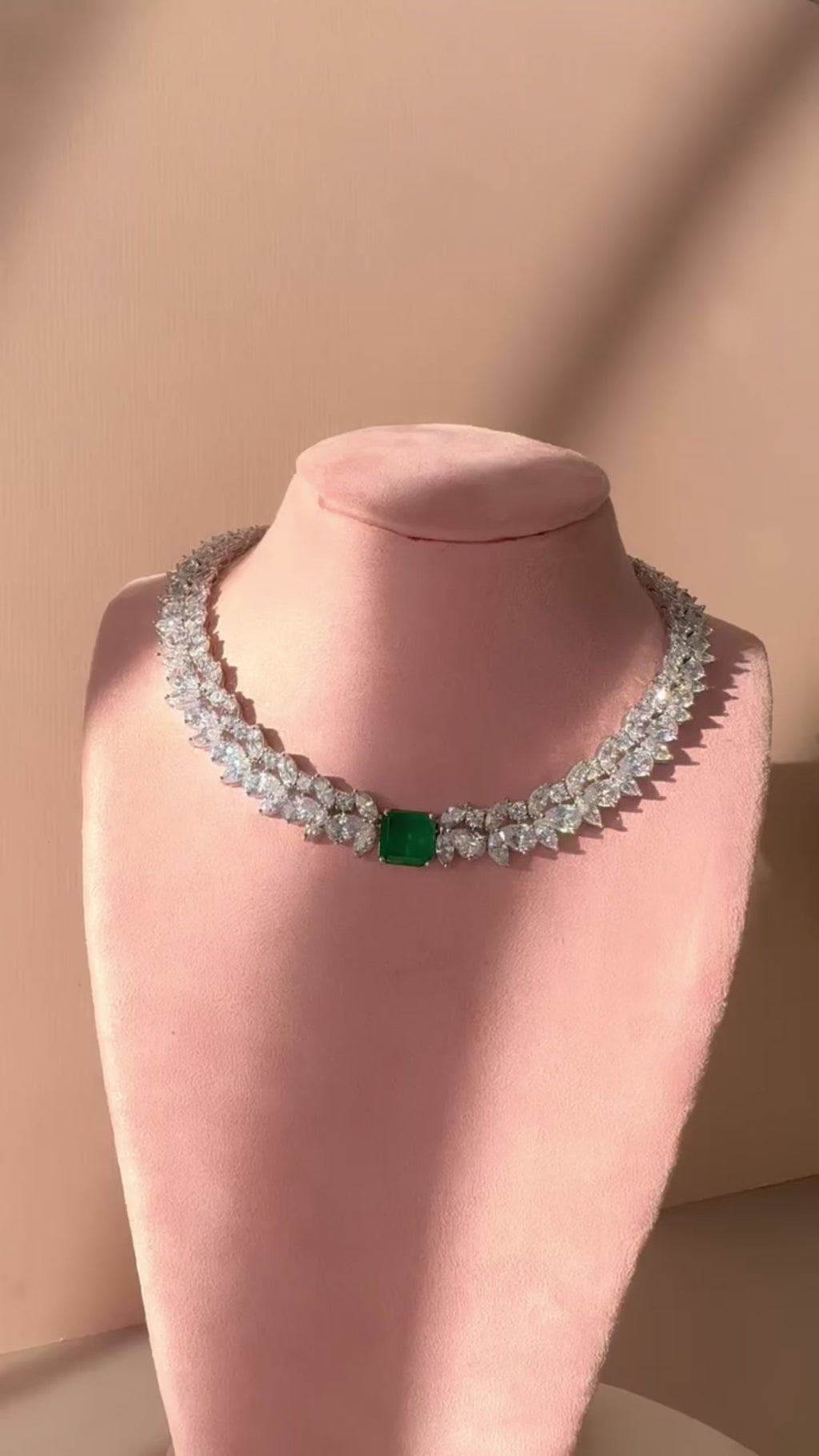 Elevate any outfit with our Daniya necklace set featuring an exquisite Emerald Green stone and sparkling American Diamond accents. Complete the look with the matching earrings for a touch of elegance and glamour.