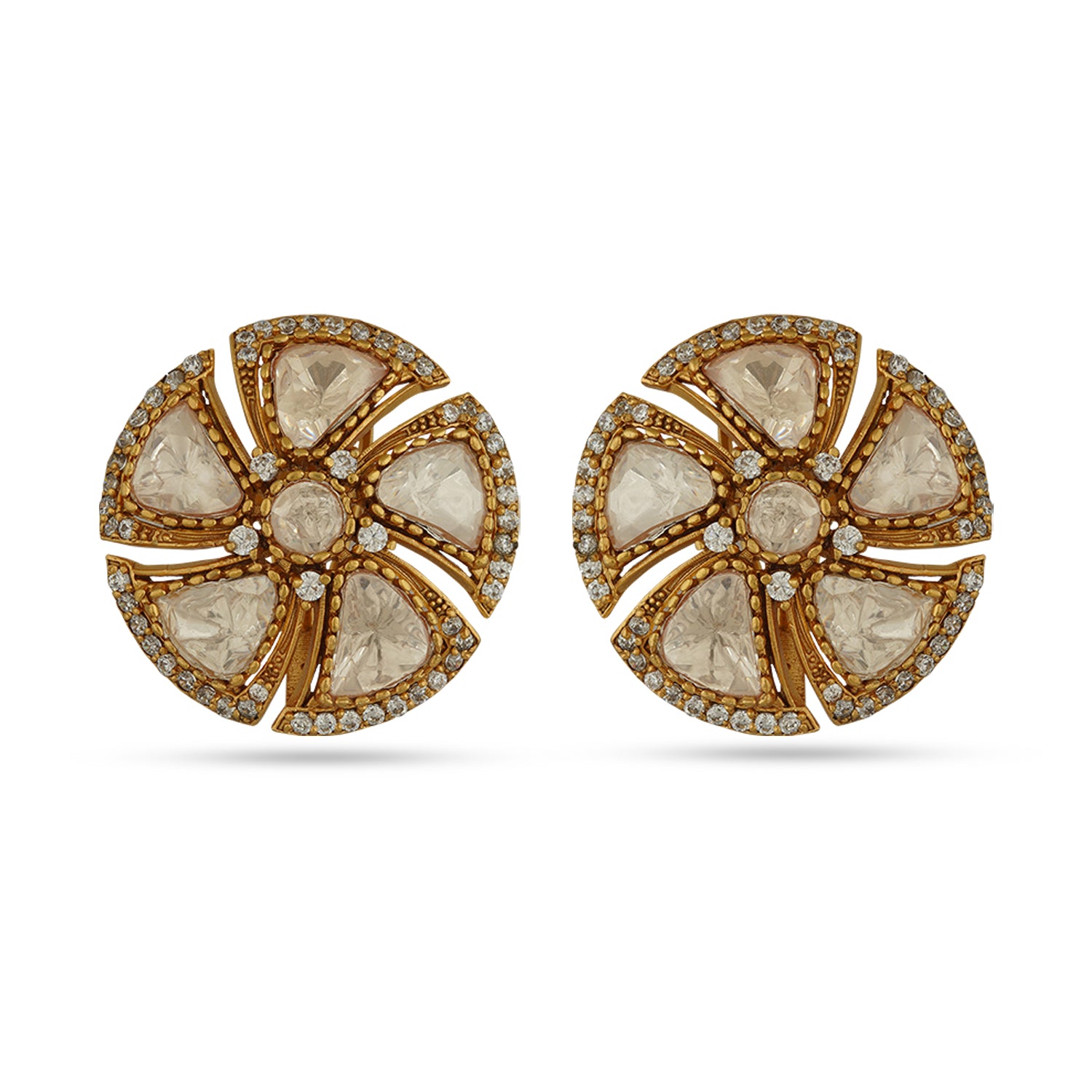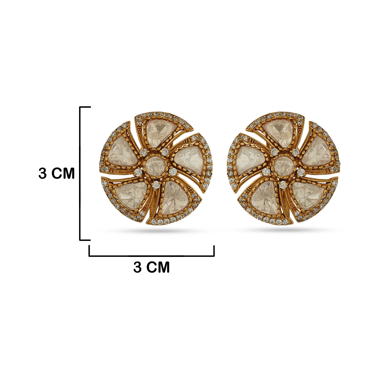 Add a touch of sophistication with Intessar's Kundan stud earrings featuring a unique wheel design and sparkling cubic zirconia accents.