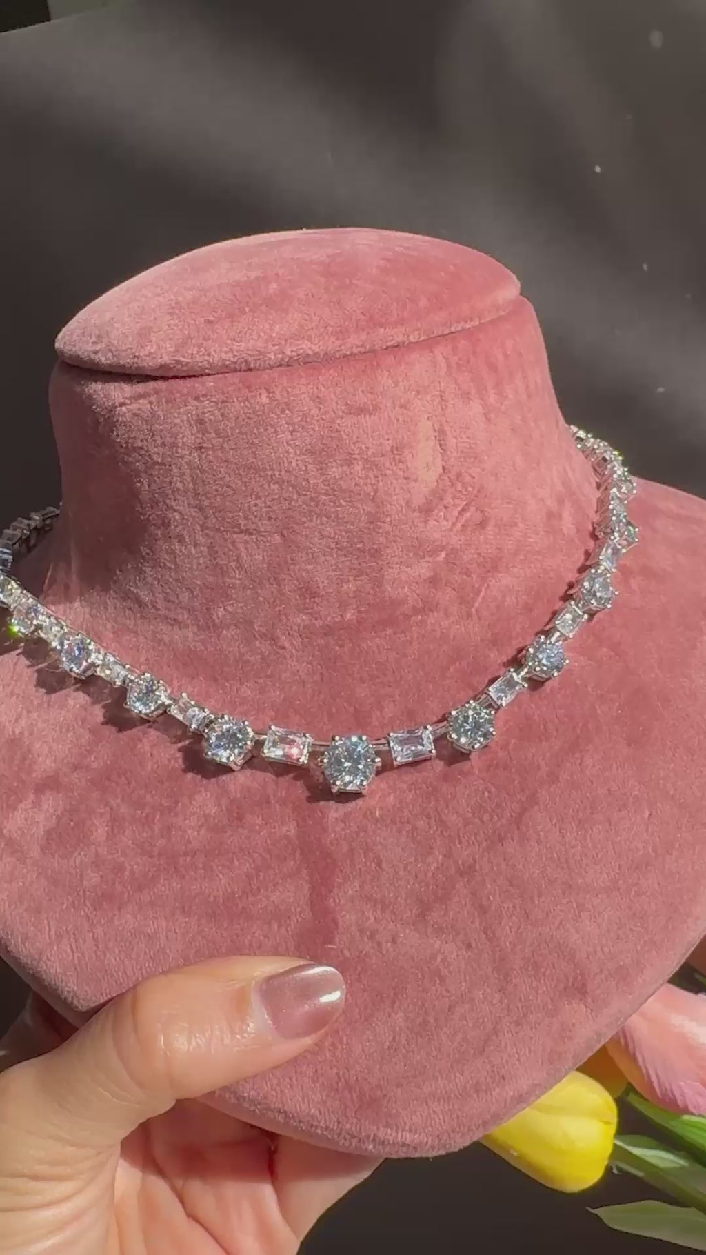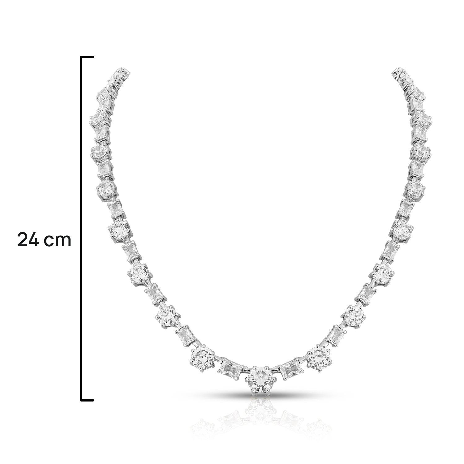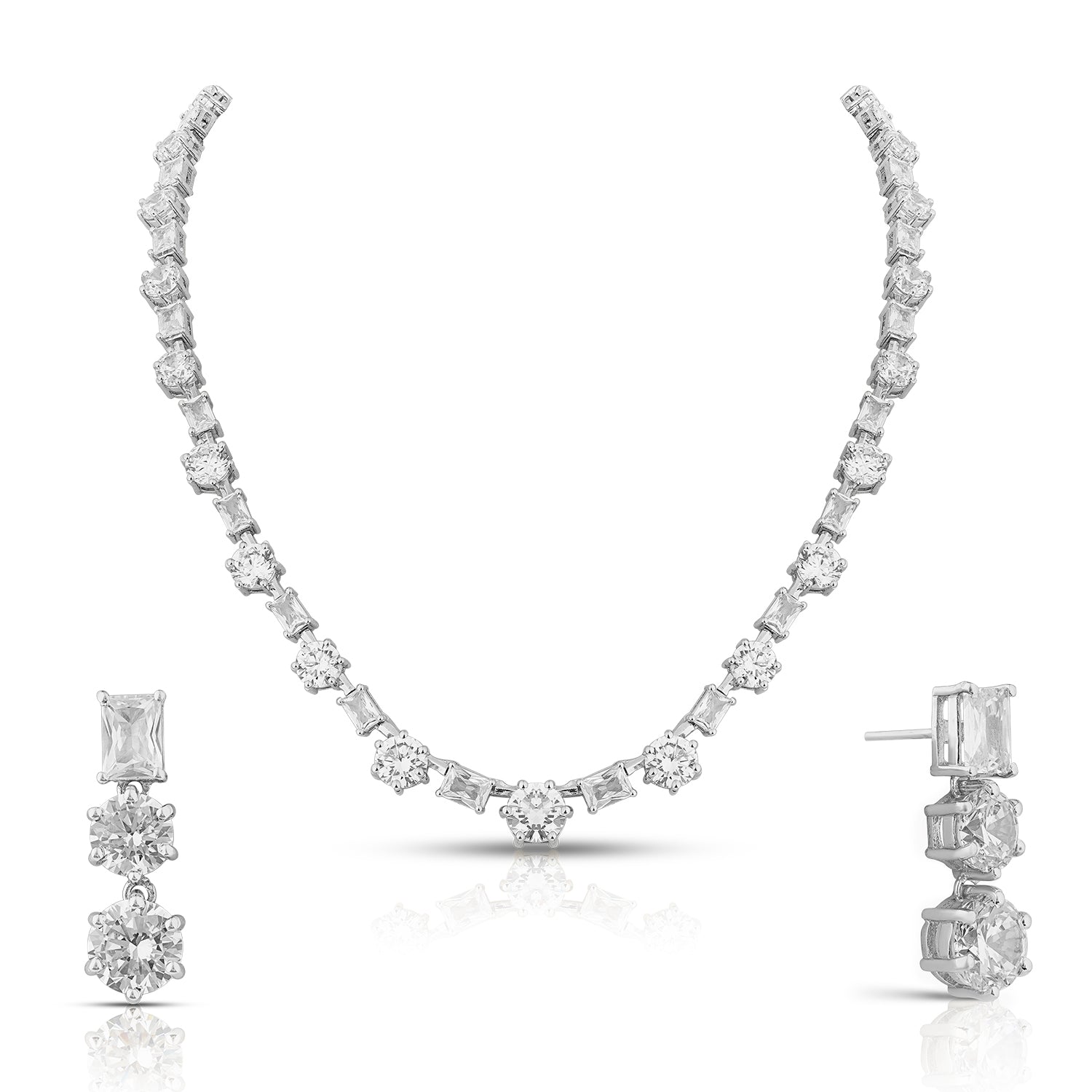 Graceful and refined, the Orelle Necklace Set is a study in timeless beauty. A delicate arrangement of baguette and round-cut stones forms a fluid rhythm, shimmering with every movement like poetry in motion. The necklace curves gently along the neckline, its elegance heightened by the refined simplicity of its matching studs.