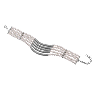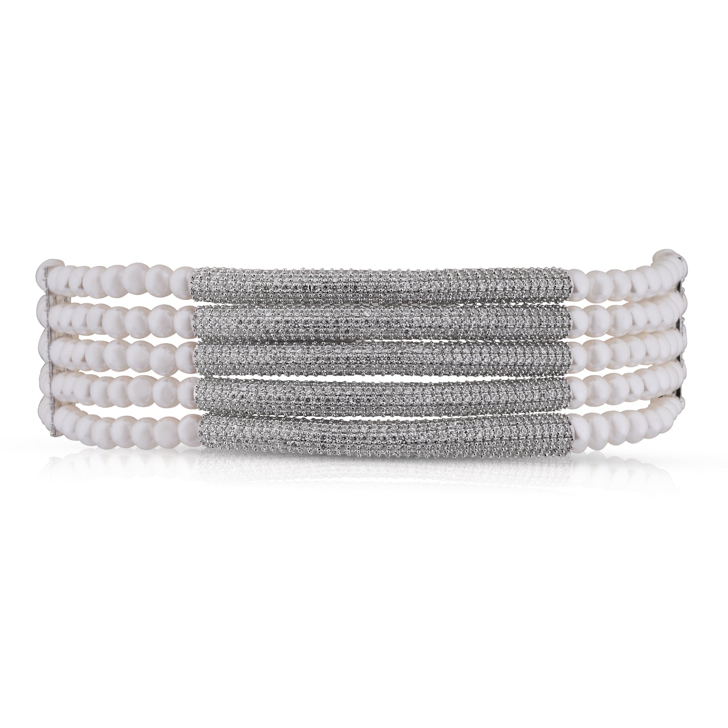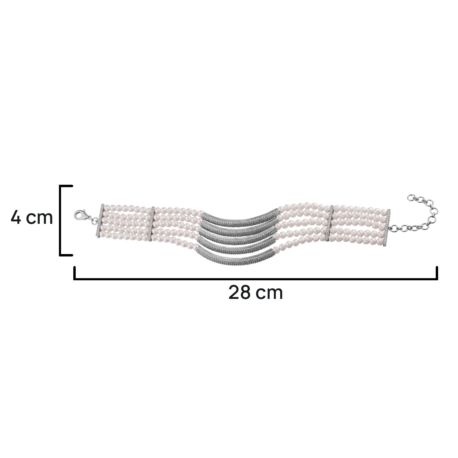 A graceful composition of sophistication and sparkle, this choker features lustrous rows of blush-toned pearls, harmoniously interwoven with CZ stones set in metallic arcs. The fluid, wave-like design adds a touch of movement and dimension, while the dual-tone detailing balances classic femininity with modern glamour. Perfect for elevating both contemporary and traditional looks.